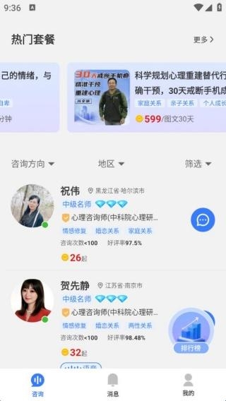 1、进入到平台咨询板块,有各种不同的心理师提供,根据需求去选择。