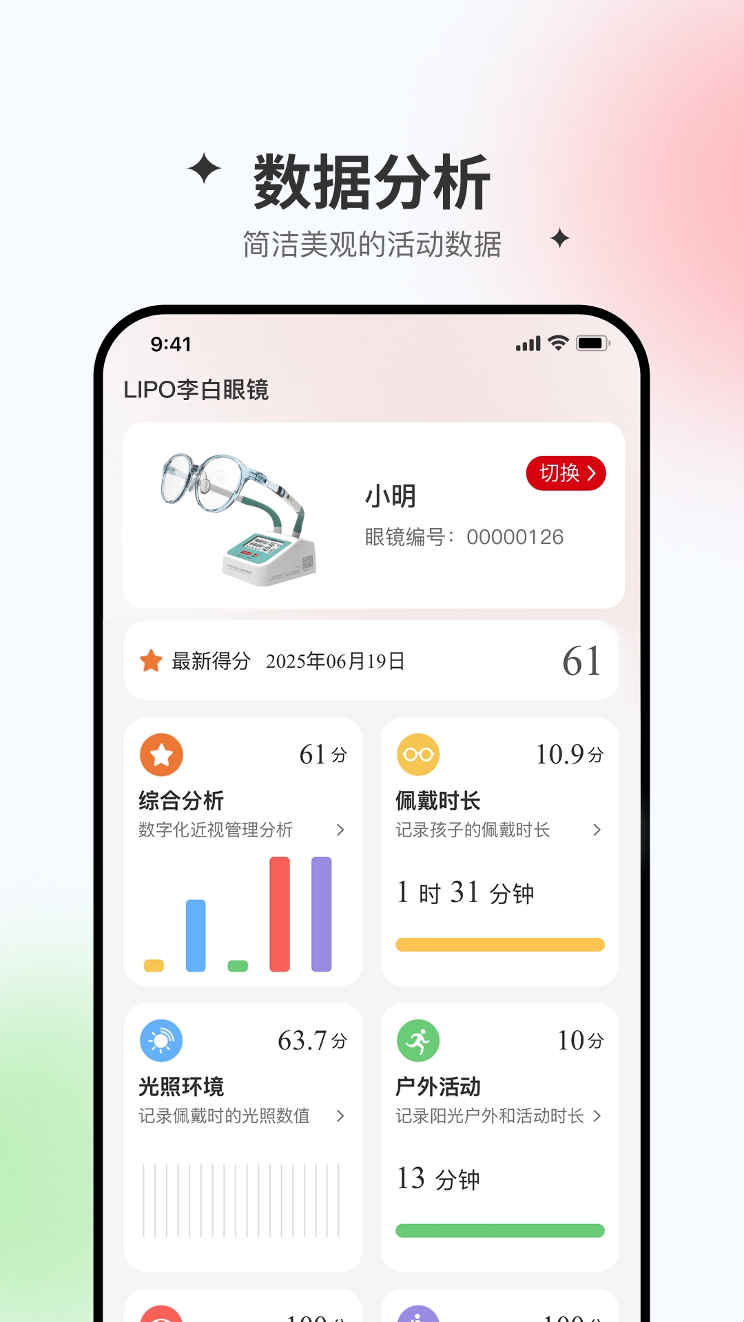 1、李白眼镜App采用直观的界面设计,将复杂的用眼数据转化为易于理解的图表和报告。