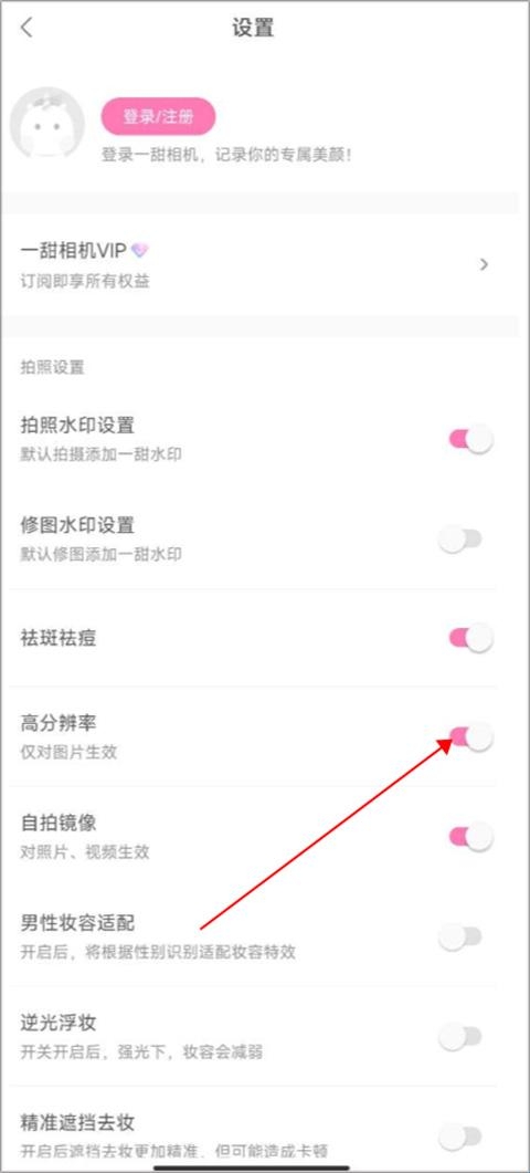 2、进去【设置】进去之后,点击高清分辨率,把它设置为打开的状态就可以了,这样我们就可以拍美美的照片了。