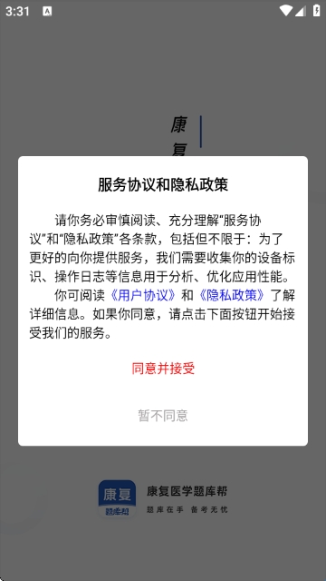 1、首次打开APP,阅读《服务协议》和《隐私政策》后,点击“同意并接受”进入APP,若“暂不同意”则无法使用。