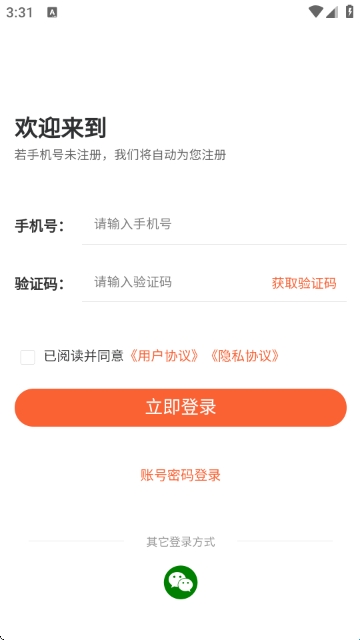 2、在登录界面,可选择验证码登录,输入手机号,获取并输入验证码,勾选“已阅读并同意《用户协议》《隐私协议》”后,点击“立即登录”;也可选择账号密码登录或其他登录方式(如微信)。