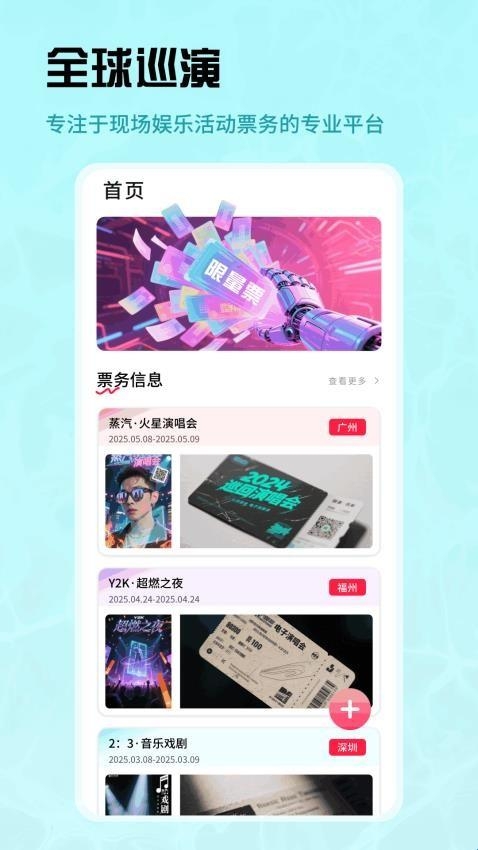 2、全球票务:在线就能产全球巡演票务信息,知道各个活动时间,方便用户选择购票参与;