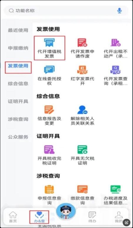 1、点击【办&查】-【发票使用】-【代开增值税发票】-【代开发票查询】查询待开具发票。