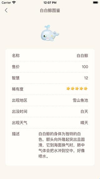 2、例如这个白白鲸,可以详细的看到它的稀有度、出现地区、出现时间等信息;