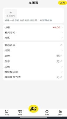 4、在卖闲置页面中上传图片、输入价格、发货方式以及地区,还有商品方面的信息,再点击右上角的发布即可。