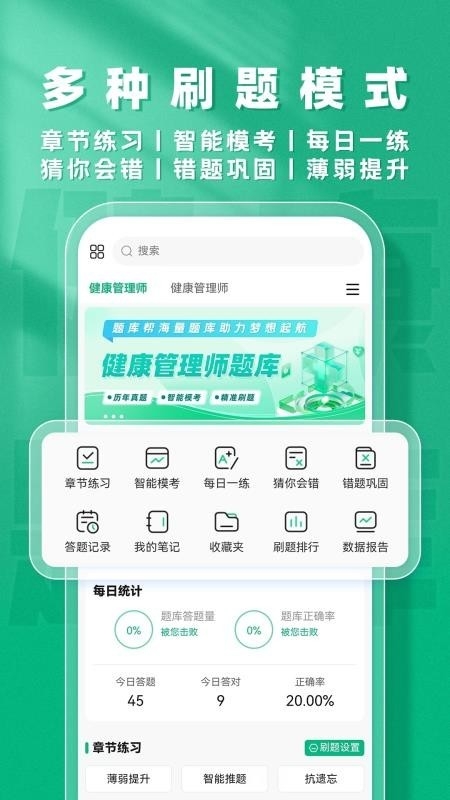 健康管理师题库帮是一款专为需要参加健康管理师考试的用户们打造的手机学习刷题软件,该软件中为用户准备了海量优质题库,该软件中为不同学习阶段的用户准备了不同的刷题题库,让每一位用户都可以根据自己的实力去进行高效的学习和刷题。如果有对这款软件感兴趣的朋友,那就快来下载试试吧!
