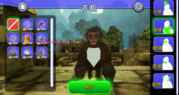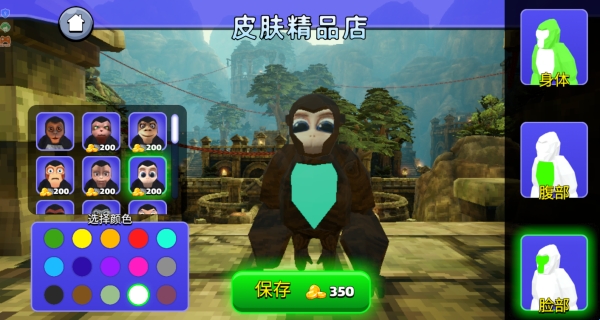 1、在 “皮肤精品店”中,利用金币选择身体、腹部、脸部的皮肤样式,搭配左侧颜色面板调整色调,打造个性化猴子形象。
