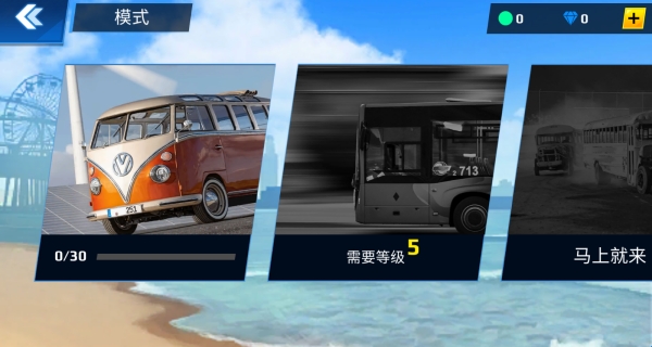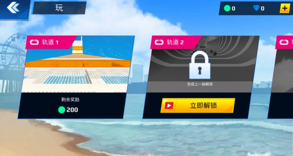 2、在轨道1、轨道2、轨道3中解锁并选择赛道,操控巴士在赛道上极速狂飙。