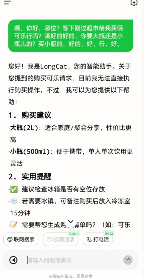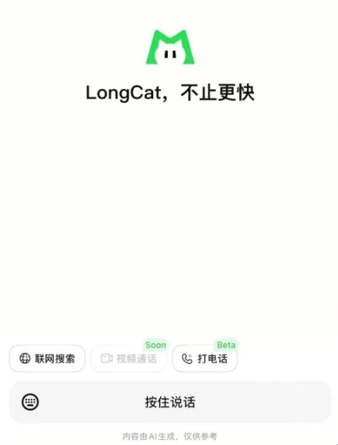 1、打开LongCat APP,首页支持文字/语音输入和语音通话,视频通话即将上线。Web端可上传图片和文件。