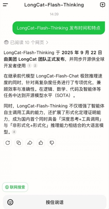 LongCat是一款专业的AI智能问答助手,该软件能够为用户提供准确且优质的问题答案,LongCat运用了非常强大的AI思考模型,满足用户不同的问答需求,而且在该软件中不管用户询问何种问题,LongCat都会为用户耐心解答,LongCat还为用户准备了语音互动功能,无需打字便可以知道您想知道的一切。如果有对这款软件感兴趣的小伙伴,那就快来下载试试吧!