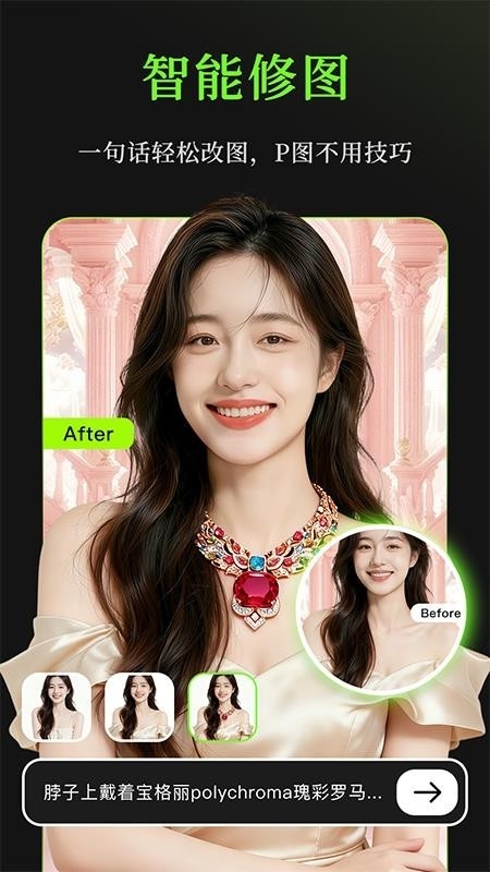 1、智能修图:软件会帮助用户智能修图,输入自己的修图思路就可一键生成,实时修图生成预期的图片。