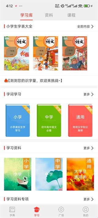 4、点击学习板块,这里涵盖小学生字表大全、字词学习、学习资料等内容