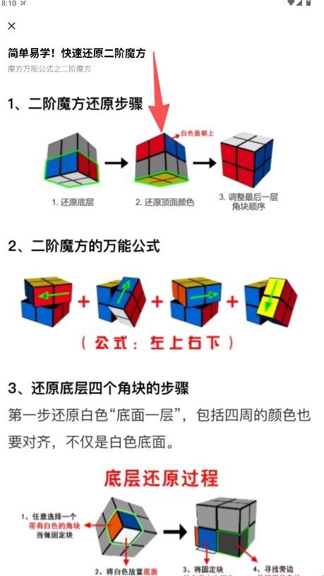 2、阅读“还原魔方的万能公式”部分、掌握“左上右下”这一核心操作要领及其具体手法。