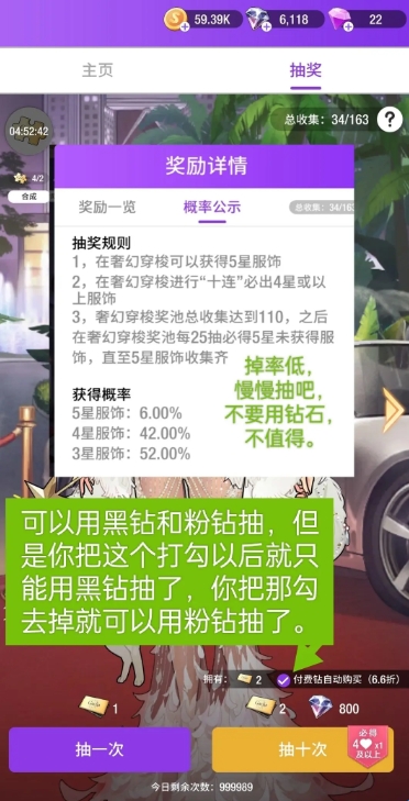 5、常驻阁的掉率很低,性价比真的不如买衣服。而且前期过关卡的话需要买一些钻石衣服的。还有不小心点到那个按钮会发现只能用黑钻石购买,把那个按钮取消掉就行。