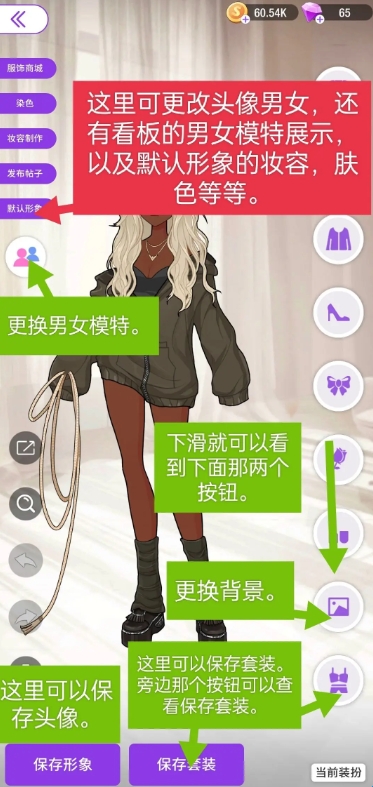3、关于更改男女头像呀,还有看板的模特更改呀。默认形象的妆容,肤色更改都在这里。