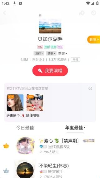 4、在歌曲中,点击下方的“我要演唱”,即可开始唱歌,底部还可以听这首歌的演唱最佳作品。