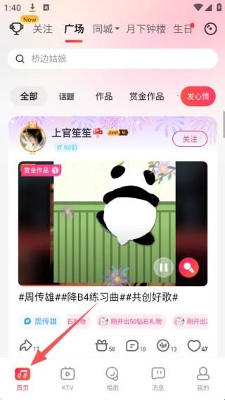 1、打开APP后进入唱吧首页,这里有众多线上用户发布的动态以及歌曲作品。