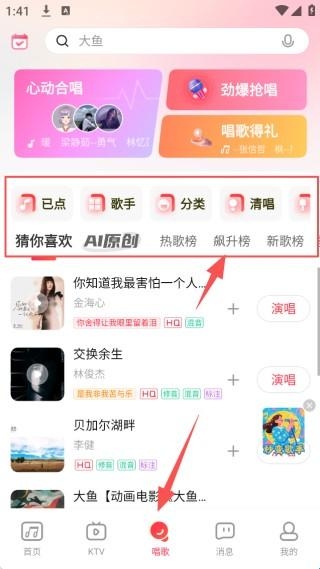 2、点击下方的“唱歌”栏目,你可以根据上方的众多分类类别来找寻歌曲。