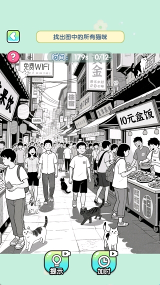 3.如下图所示,在夜市找猫咪关卡中,玩家需要在三分钟的时间内找到所有的猫咪才能成功闯关。