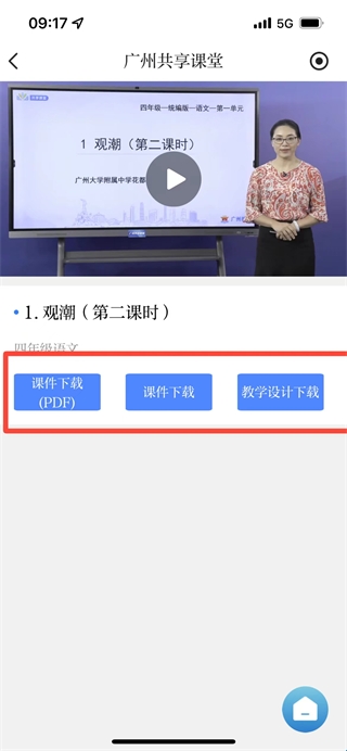 选择完成后,点击相关课程,进入课程详情页面,即可进行课件(PDF)下载、课件下载以及教学设计下载