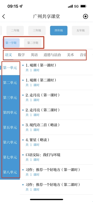 选择对应的学期,相应的学科以及想要学习的单元