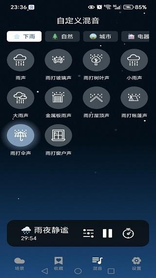 2、在收藏页面,为我们展示了多元化的白噪音素材,一键播放。