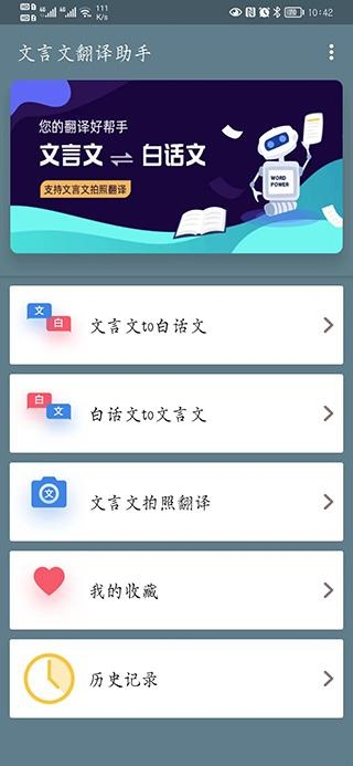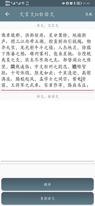 1、软件有文言文to白话文、白话文to文言文、文言文拍照翻译、我的收藏和历史记录等功能,选择自己需要的功能;