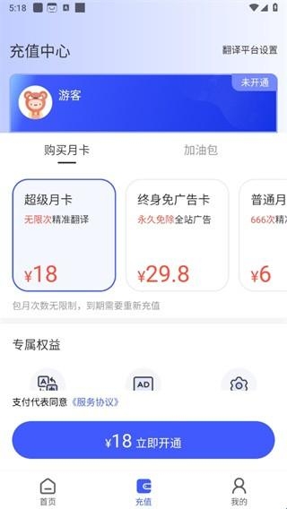 3、切换到我的页面有翻译记录、应用实时翻译、输入翻译等功能;