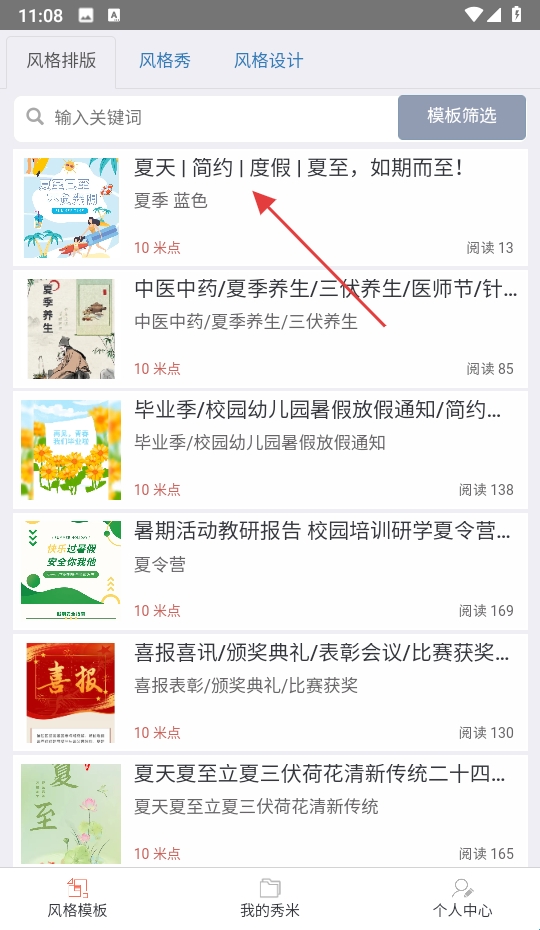 2、在风格秀页面点击选中模板标题进入详情。