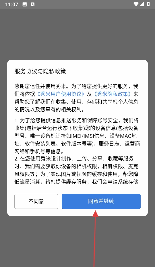 1、点击【同意并继续】接受秀米服务协议与隐私政策。