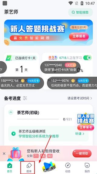 1、登录茶艺师考试聚题库app,点击下方【题库】;