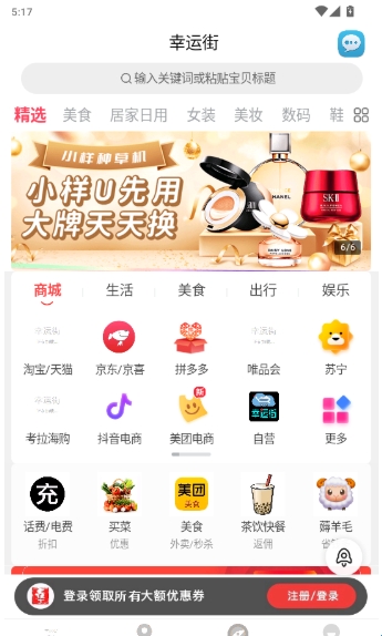幸运街是由重庆幸运街网络有限公司打造的一款汇集了各大电商平台优惠的手机购物软件,该软件中为用户准备了诸多精选商品,用户可以在该软件中找到各种类型或商品的优惠券,并且该软件还为用户提供了单单返佣的福利,让用户可以在一边享受优惠券购买商品的福利下,还能够进行返利,让用户惠上加惠,用最划算的价格买到最满意的商品。