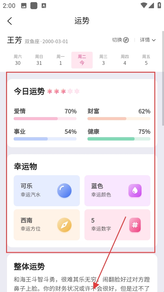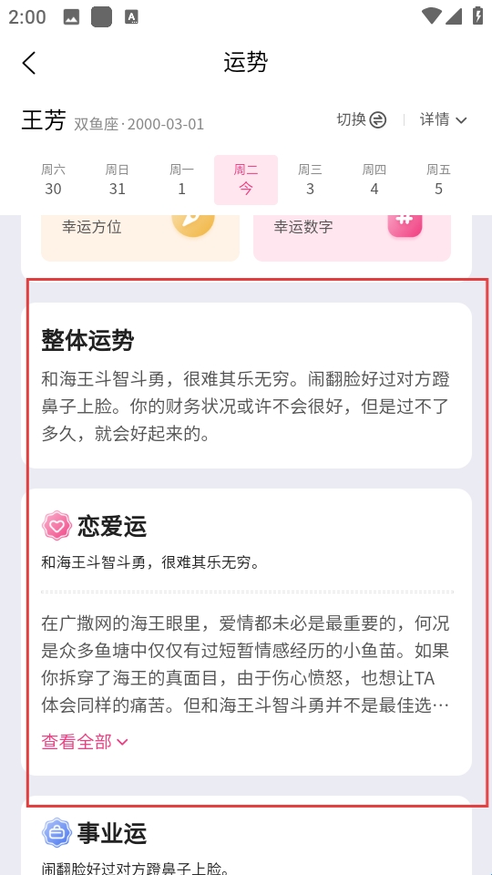 3、下面还可以查看整体运势,恋爱运等详细文字描述完整内容。