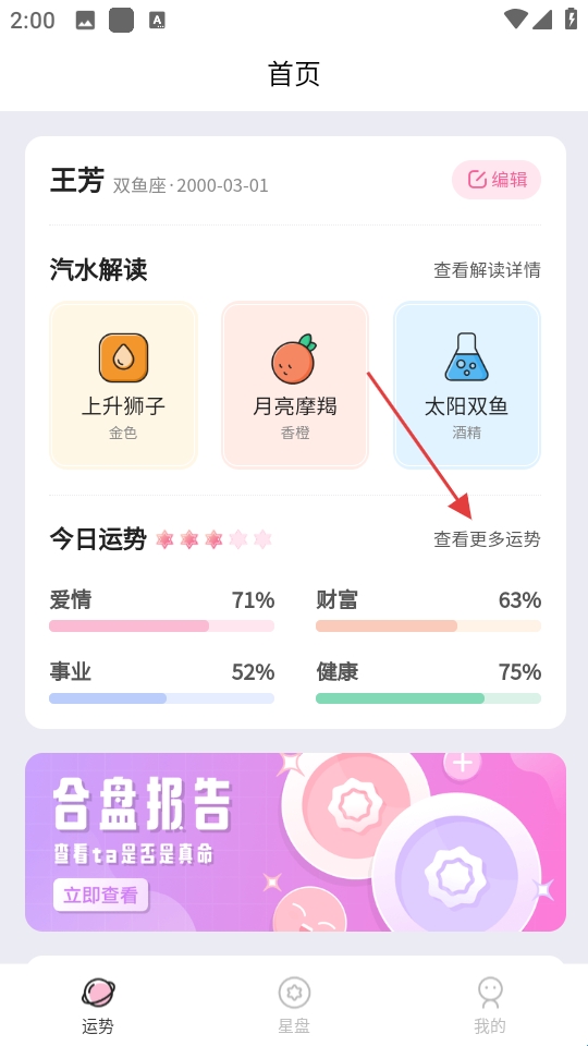 1、在首页,点击查看更多运势,进入运势详情页面。
