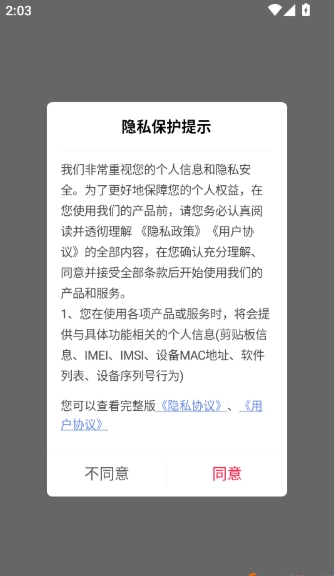 1、首先打开软件阅读“隐私保护提示”后,点击“同意”按钮进入APP