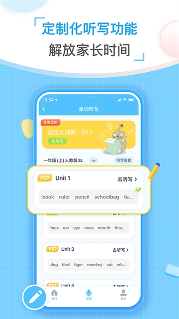 3、单词听写:对平台的单词进行听写,通过听写就可以帮助孩子记住更多的英语单词内容了;