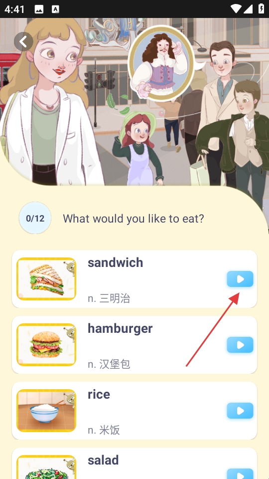 3、在单词学习页,点击单词右侧的播放按钮,可播放单词发音。