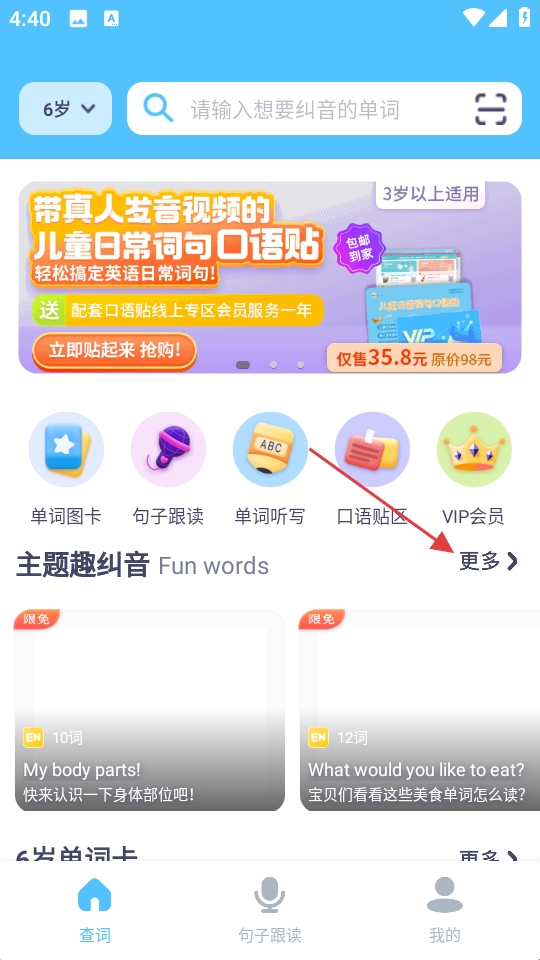 1、在查词页面,点击主题趣纠音旁的更多,进入全部主题列表。