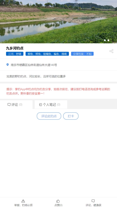 3、地图点击:钓鱼点(内涵:钓鱼点详情介绍,可在此进行打卡,收藏,点评,分享,或是记录钓鱼情况)