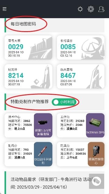 3、例如我们可以查看每日地图密码,或者特勤处制作产物推荐,