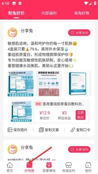 2、好物圈展示敏感肌护理等高性价比商品,用户分享使用心得,支持保存图片、复制文案与口令,交流互动中发现好物,参与活动还能赢免单,让购物兼具乐趣。