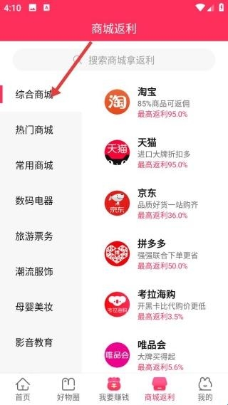 3、商城返利页罗列淘宝京东等平台,不同品类返利比例明确,搜索商城即可拿返利,购物时同步享优惠,从日常消费到品质选购,助力用户省心省钱。