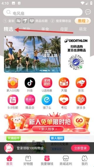 1、首页聚合抖音天猫等多平台入口,设有新人0元购、9包邮等福利区,搜索栏方便查找好物,顶部轮播夏日精选,底部导航覆盖购物全流程,开启社交电商便捷体验。