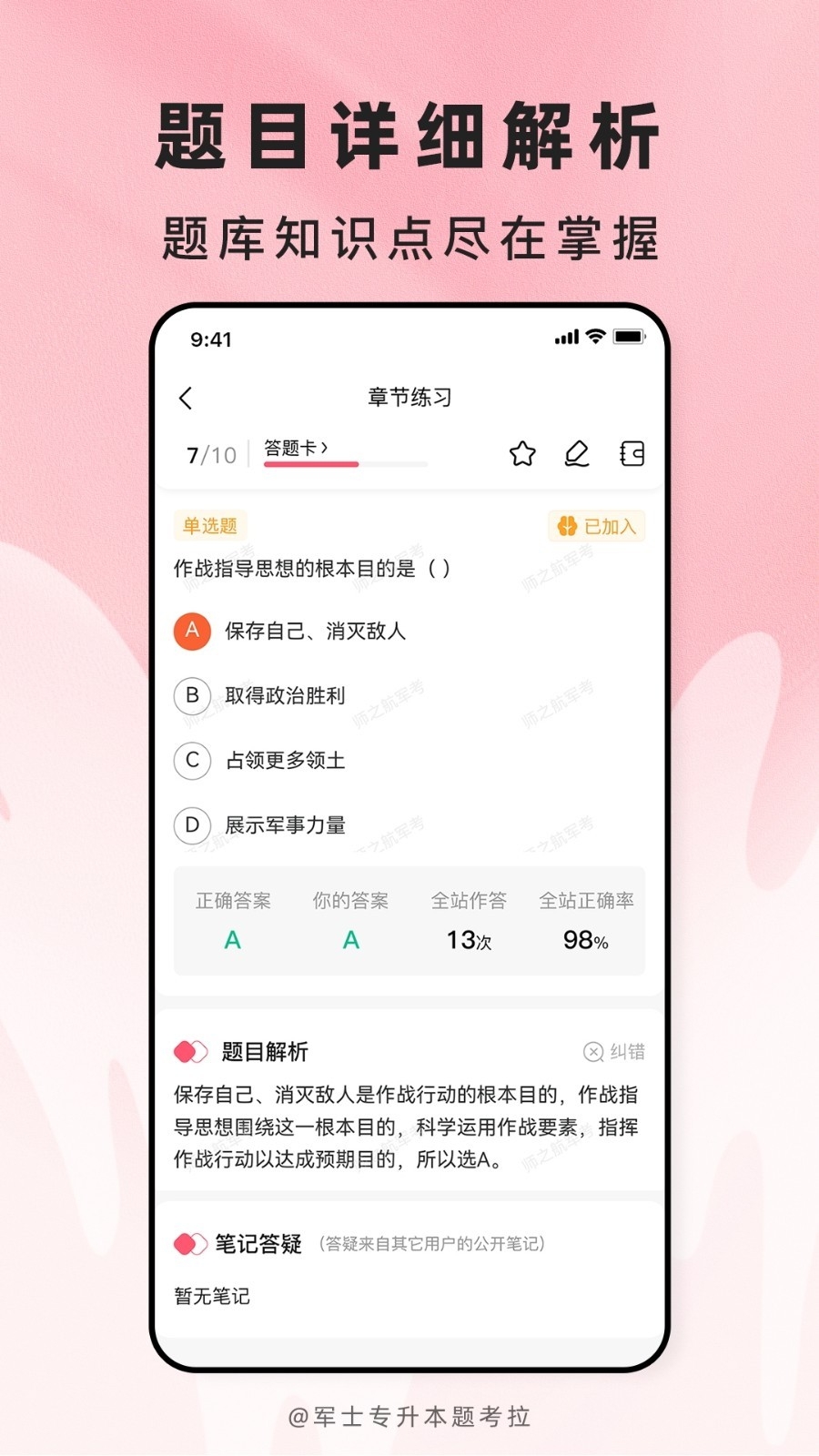 5、免费题库:逐题解析,巧妙刷题,还免费,更有考试技巧与最新军考资讯;