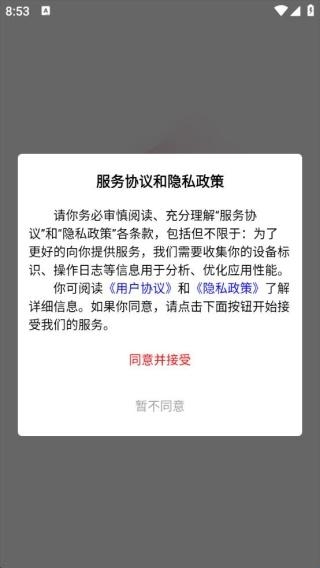 2、弹出服务协议和隐私政策,阅读后点击同意。