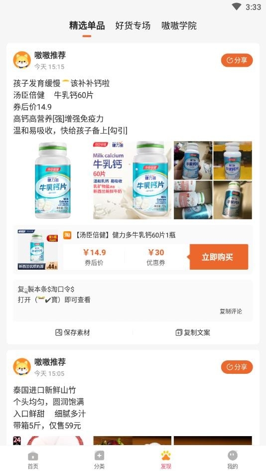 5、素材选择:自由查找和选择优质商品素材,可一键复制文案和保存图片,方便用户购物;