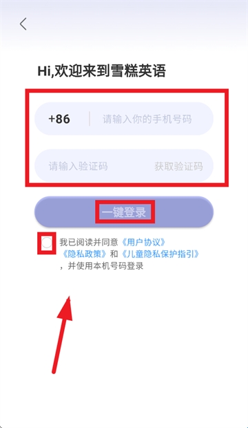 2、跳转至登录界面后,输入手机号,验证码,勾选我已阅读并同意 《用户协议》《隐私政策》和《儿童隐私保护指引》,并使用本机号码登录,点击一键登录即可