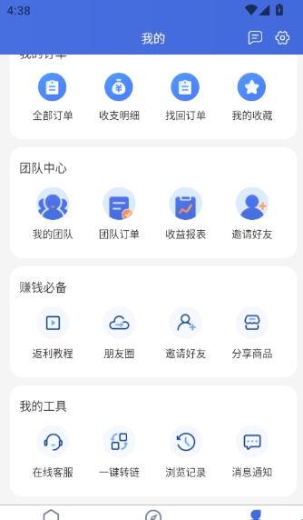5、之后在“我的”功能菜单界面找到“赚钱必备”模块下面的“返利教程”按钮点击进入