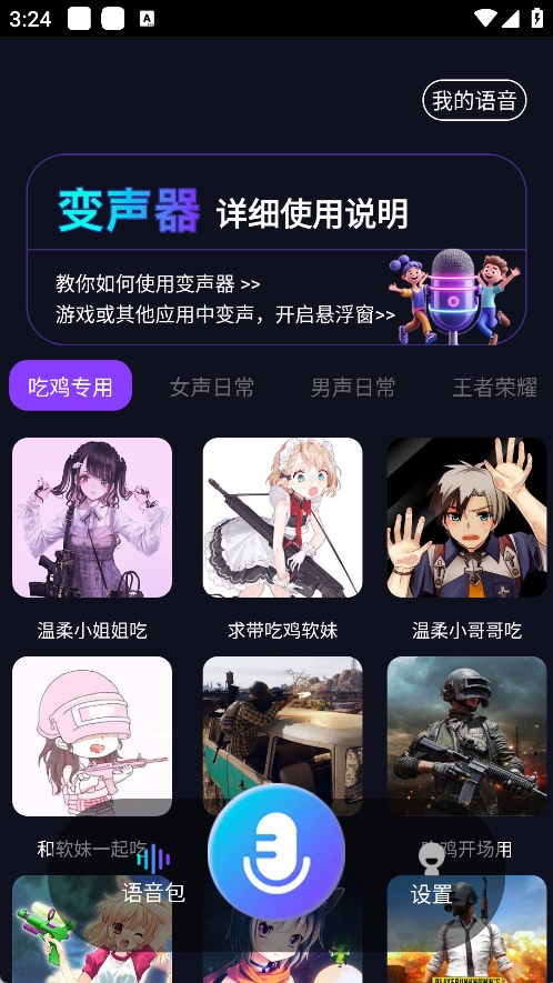 2、这里提供的语音包很多,有吃鸡专用、女声日常、男声日常 、王者荣耀、我是歌手、怼人等等类别。