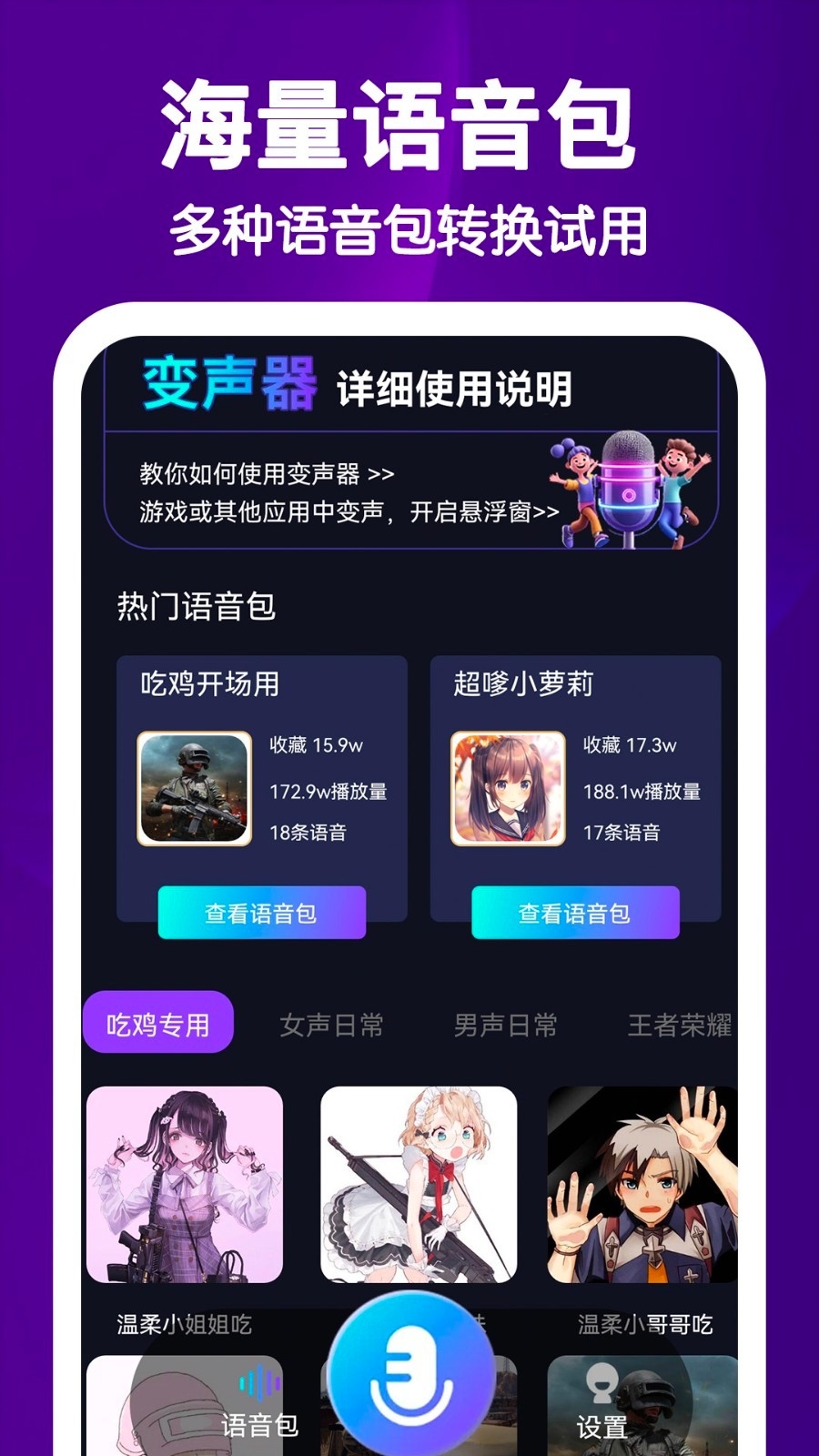 4、海量真人语音包:给你在游戏聊天中增加更多乐趣,吃鸡、王者等热门游戏,日常聊天、清唱合集,总有一款变声器语音包适合你,好玩有趣的变声软件,让你感受不一样的乐趣。